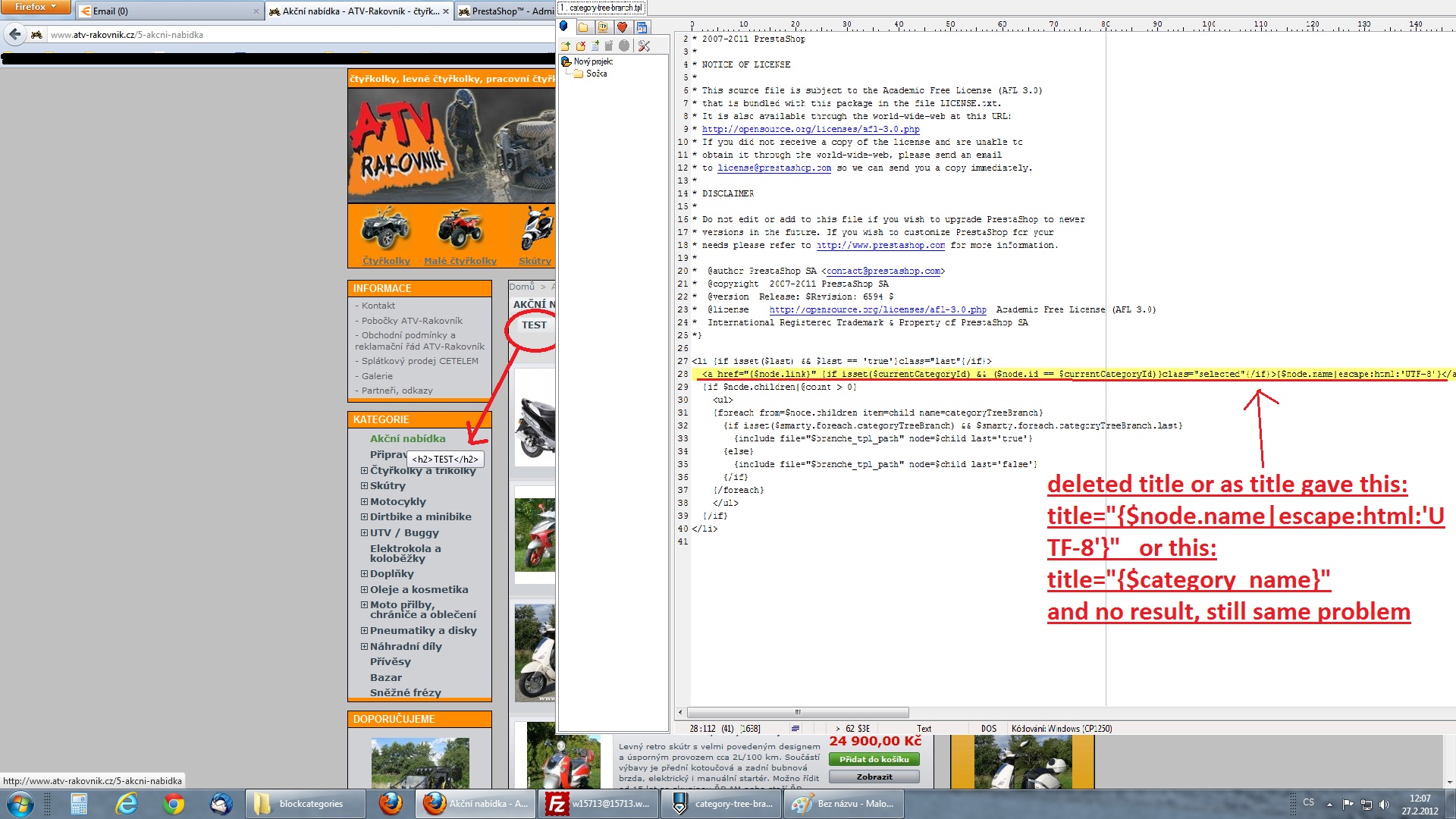 vasekcekal Posted February 27, 2012 Share Posted February 27, 2012 (edited) Hi, I edited my theme and I can use HTML in category description. But this desctription is also in category tree like a-title. See attached pict. I tried edit category-tree-branch.tpl and no result. I also clean cache, re-compile my theme and problem is still here. Please, can anybody give me a help? Thanks EDIt: Problem solved ) I give this: " title="{$node.desc|strip_tags:false|escape:html:'UTF-8'}" " into category-tree-branch.tpl and still same problem. Then I manually delete via FTP all inside tools/smarty/ cache and compile ) All is OK Edited February 27, 2012 by vasekcekal (see edit history) Link to comment Share on other sites More sharing options...