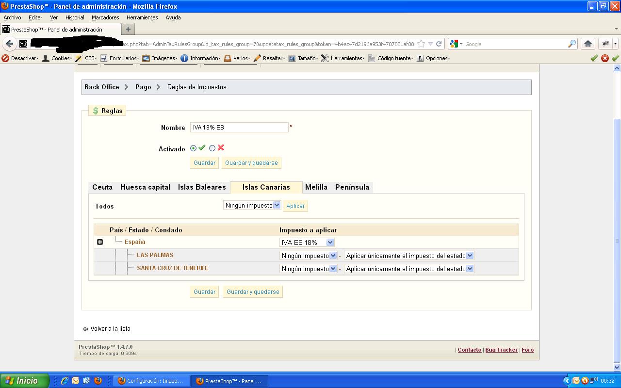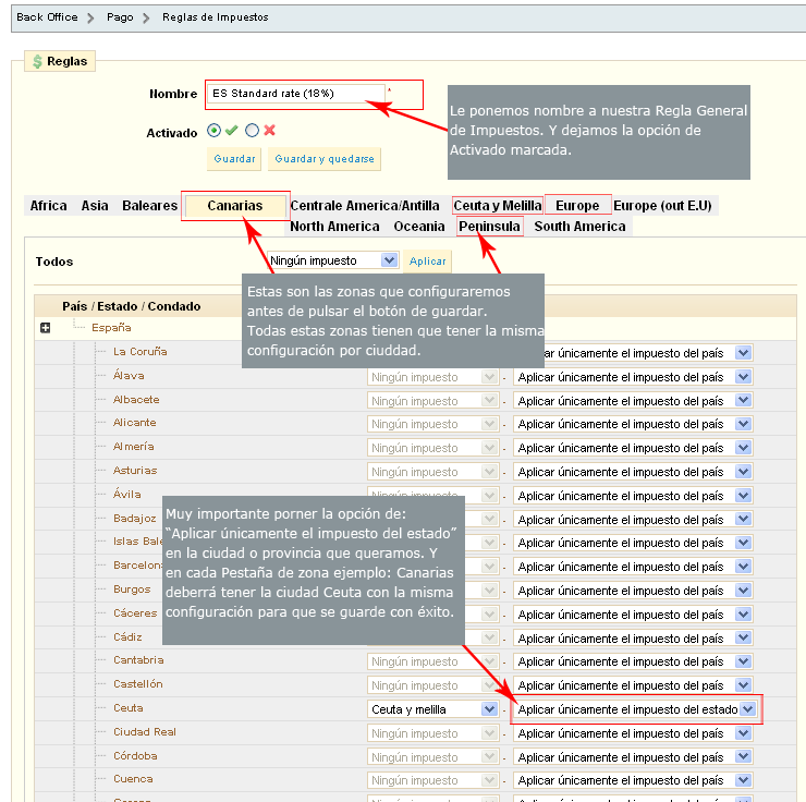 E-kipper Posted April 14, 2012 Share Posted April 14, 2012 No hace falta crear un impuesto a tipo cero para Canarias, Ceuta y Melilla; basta definir una zona llamada 'Canarias ceuta melilla', y en la regla del impuesto para esa zona elegir "ningún impuesto" y "aplicar únicamente el impuesto del estado". Además creamos las provincias (estados), ponemos Santa Cruz de Tenerife, Las Palmas, Ceuta y Melilla en esa zona, activamos los estados en España, y cambiamos el formato de la dirección para que obligue a elegir la provincia entre las del desplegable. Y listos. En cuanto a la duda de wellbutr, pues no lo he mirado, pero igual si lo haces como yo, no te sale así. Prueba. Adjunto pantallazo regla, saludos. Link to comment Share on other sites More sharing options...