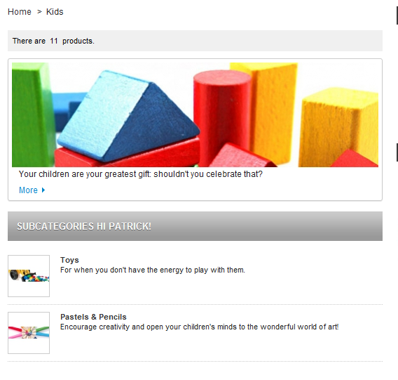 patrmich Posted March 15, 2012 Author Share Posted March 15, 2012 Hi, My site is not yet on line. But you can have a look at the here below link : http://demo-store.prestashop.com/en/12-kids My goal would be to add some text between SUBCATEGORIES and Toys Thank you in advance for any help. Patrick Link to comment Share on other sites More sharing options...