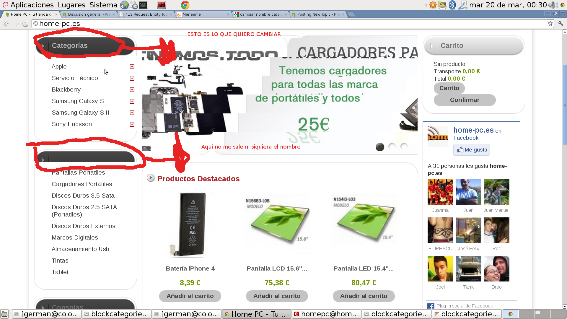 illohacker Posted March 19, 2012 Share Posted March 19, 2012 Hola, quiero cambiar el nombre de las categorías que tengo en la web, no el nombre en el catálogo si no lo que ve el cliente. Adjunto una captura PD: la URL de la web es home-pc.es Link to comment Share on other sites More sharing options...