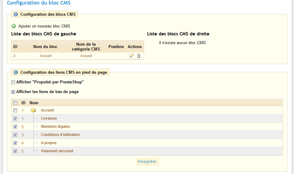 J'ai bien positionné le bloc cms dans le footer (Modules < Positions)