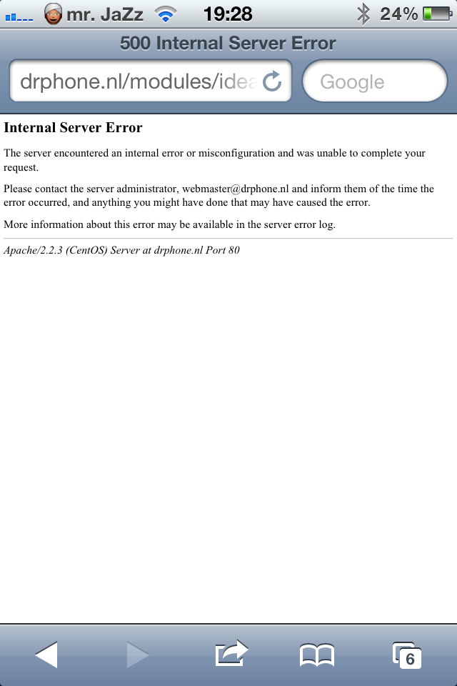 drphone Posted March 24, 2012 Author Share Posted March 24, 2012 Internal Server Error The server encountered an internal error or misconfiguration and was unable to complete your request. Please contact the server administrator, [email protected] and inform them of the time the error occurred, and anything you might have done that may have caused the error. More information about this error may be available in the server error log. Apache/2.2.3 (CentOS) Server at drphone.nl Port 80 Link to comment Share on other sites More sharing options...