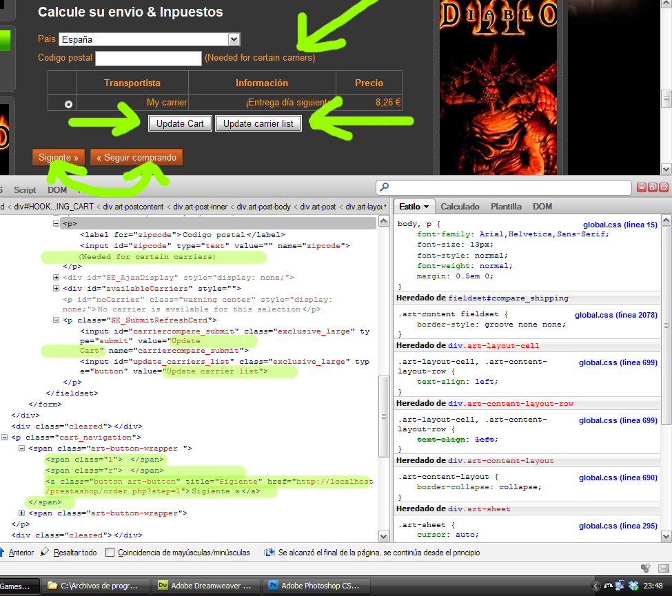 y tampoco puedo cambiar la posición de los botones "siguiente " y seguir comprando"