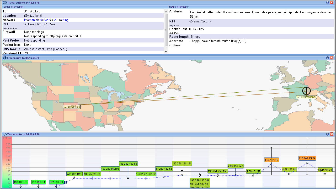 infomaniak Posted March 30, 2012 Share Posted March 30, 2012 Je fais que de constater ci-joins une image qui parle d'elle même les IP commençant avec 4 sont aux USA à Broomfield Qu'on m'explique pourquoi ? Je viens de faire un traceroute vers votre IP 92.138.110.1 et cela ne passe pas par les USA. Le ping est en dessous de 25ms pour vous joindre : 3 10ge-3-3.ixe-gva-02.net.infomaniak.ch (84.16.64.78) 0.917 ms 0.558 ms 0.539 ms 4 10ge-2-1.br02.net.infomaniak.ch (84.16.64.6) 0.802 ms 0.752 ms 0.711 ms 5 te-4-2.car1.geneva1.level3.net (213.242.73.53) 0.609 ms 0.582 ms 0.574 ms 6 ae-5-5.car1.lyon1.level3.net (4.69.137.82) 3.177 ms 3.299 ms 3.158 ms 7 ae-9-9.ebr1.paris1.level3.net (4.69.134.50) 9.663 ms 9.391 ms 9.528 ms 8 ae-57-222.csw2.paris1.level3.net (4.69.161.58) 9.676 ms ae-59-224.csw2.paris1.level3.net (4.69.161.66) 9.649 ms ae-56-221.csw2.paris1.level3.net (4.69.161.54) 9.780 ms 9 ae-2-52.edge4.paris1.level3.net (4.69.139.234) 9.562 ms * * 10 tengige0-10-0-4.pastr1.paris.opentransit.net (193.251.252.137) 13.869 ms 81.52.179.161 (81.52.179.161) 10.767 ms 193.251.247.29 (193.251.247.29) 11.387 ms 11 xe-8-0-0-0.auvtr3.aubervilliers.opentransit.net (193.251.132.246) 10.269 ms 10.093 ms 10.119 ms 12 tengige0-0-0-6.ffttr3.frankfurt.opentransit.net (193.251.131.182) 29.899 ms tengige0-9-0-3.ffttr3.frankfurt.opentransit.net (193.251.128.9) 26.463 ms * 13 astrasbourg-256-1-111-1.w92-138.abo.wanadoo.fr (92.138.110.1) 24.328 ms 25.585 ms 24.185 ms Il faut contacter votre fournisseur d'accès pour qu'il puisse vous expliquer pourquoi lui préfère une route plus longue au trajet direct ! C'est lui qui à votre réponse. Par contre le serveur avec l'ip 213.242.7.54 qui est à Genève ne fonctionne pas correctement. Beaucoup de routeurs sur les chemins ne sont pas "pingables", c'est tout à fait normal et dépend de la sécurité et de la configuration de chaque réseau emprunté. Infomaniak Network SA Fabian Lucchi Link to comment Share on other sites More sharing options...