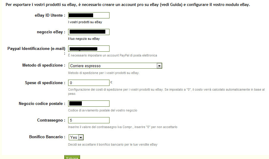 virofla Posted March 31, 2012 Author Share Posted March 31, 2012 Di seguito le principali caratteristiche del modulo: Gestione categorie ebay Gestione categorie negozio ebay Possibilità di inserire un prezzo d'impatto suddiviso per categoria Costo per per ogni prodotto aggiuntivo suddiviso per categoria Accetta pagamenti paypal Accetta pagamenti contrassegno Accetta pagamenti bonifico bancario Template editabile per le inserzioni Possibilità d'inviare tutto il catalogo su ebay Possibilità di aggiornare solo determinate categorie su ebay Scarico ordini da ebay generando nuovo ordine in prestashop Testato dalla versione 1.4.2 alla 1.4.7 Link to comment Share on other sites More sharing options...