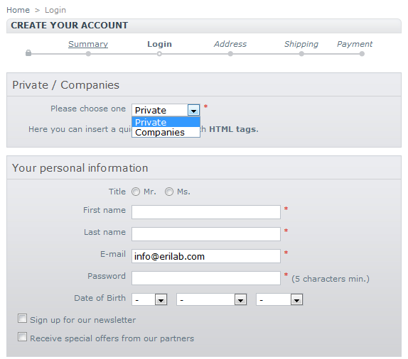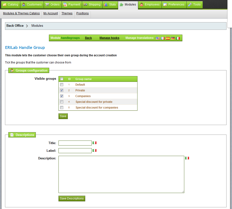 oleo80 Posted April 1, 2012 Share Posted April 1, 2012 Salve a tutti, vi comunico che il nostro modulo ERILab Handle Groups è stato accettato ed è ora disponibile per il download su addons.prestashop.com. Questo modulo permette ai clienti di scegliere il proprio gruppo di appartenenza al momento della registrazione di un nuovo account. Ad esempio è possibile far scegliere ai clienti tra "Privati" e "Aziende" ed applicare quindi automaticamente un diverso regime fiscale. Nel backend del modulo è possibile specificare quali gruppi saranno disponibili e quali nascosti. Ad esempio se avete i seguenti gruppi: 1) privati 2) aziende 3) organizzazioni no-profit 4) sconti grandi forniture potete abilitare i primi tre gruppi e nascondere l'ultimo. In questo modo i clienti che si registreranno dovranno scegliere tra "privati", "aziende" e "organizzazioni no-profit". Ogni feedback sarà molto apprezzato! Link to comment Share on other sites More sharing options...