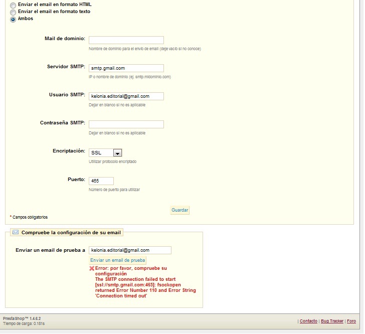 nadie Posted April 14, 2012 Share Posted April 14, 2012 Error: Error: por favor, compruebe su configuración The SMTP connection failed to start [ssl://smtp.gmail.com:465]: fsockopen returned Error Number 110 and Error String 'Connection timed out' Has configurado siguiente esta guía: http://www.blmodules.com/prestashop-tutorials-users/how-to-set-send-email-from-prestashop-using-smtp-gmail/ tu cuenta gmail? Link to comment Share on other sites More sharing options...