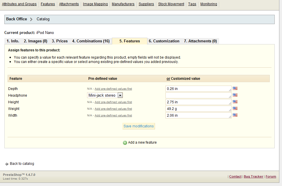 Mike Kranzler Posted April 2, 2012 Share Posted April 2, 2012 Hi andyh, Have you already created the features and feature values in your Back Office under Catalog > Features? Once you've done that, you can select the proper features in the Features tab for each individual product, and it will show up at the bottom of the product listing. I hope this helps. -Mike Link to comment Share on other sites More sharing options...