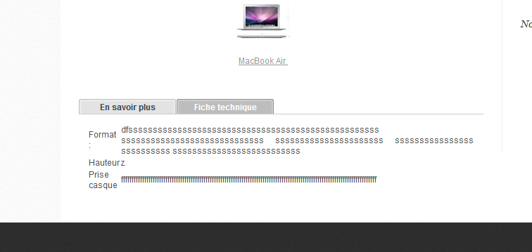 fdavid67 Posted April 3, 2012 Share Posted April 3, 2012 Salut tout le monde. Je suis entrain de modifier l' affichage de la fiche technique. J'ai modifier le fichier product.tpl afin qu' elle apparaisse sous forme de tableau, mais j'ai un problème lorsque la caractéristique est sur plusieurs ligne, car dans le FO, tout apparaît à la suite, sur 1 seul ligne. Je vous joint une photo pour vous illustrer le problème. J' espère que quelqu'un à une solution car mes caractéristiques peuvent aller jusqu'à 10 lignes. Merci d' avance. Link to comment Share on other sites More sharing options...