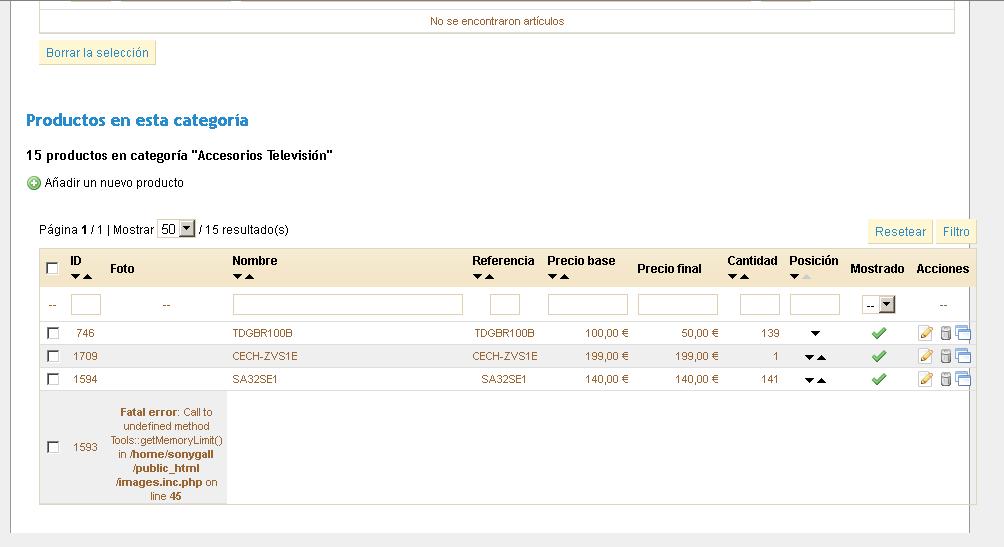 Trasgu Posted April 9, 2012 Share Posted April 9, 2012 Area Manager / Catalog to list the products, breaks out the list and not complete, giving the following error: Fatal error: Call to undefined method Tools :: getMemoryLimit () in / home / public_html / images.inc.php on line 45. The error is positioned in the cell in the photo. The photos of the products list (3 or 4 according to the category) are not. Certainly in the store are all products well. See if you can help me. thanks ******************** En la zona de Administrador/Catalogo al listar los productos, se rompe la lista y no sale completa, dando el siguiente error: Fatal error: Call to undefined method Tools::getMemoryLimit() in /home/public_html/images.inc.php on line 45. El error lo posiciona en la celda de la foto. Las fotos de los productos que lista (3 o 4 segun la categoria ) no se ven. Por cierto, en la tienda se ven todos los productos perfectamente. A ver si me podeis ayudar. Gracias Link to comment Share on other sites More sharing options...