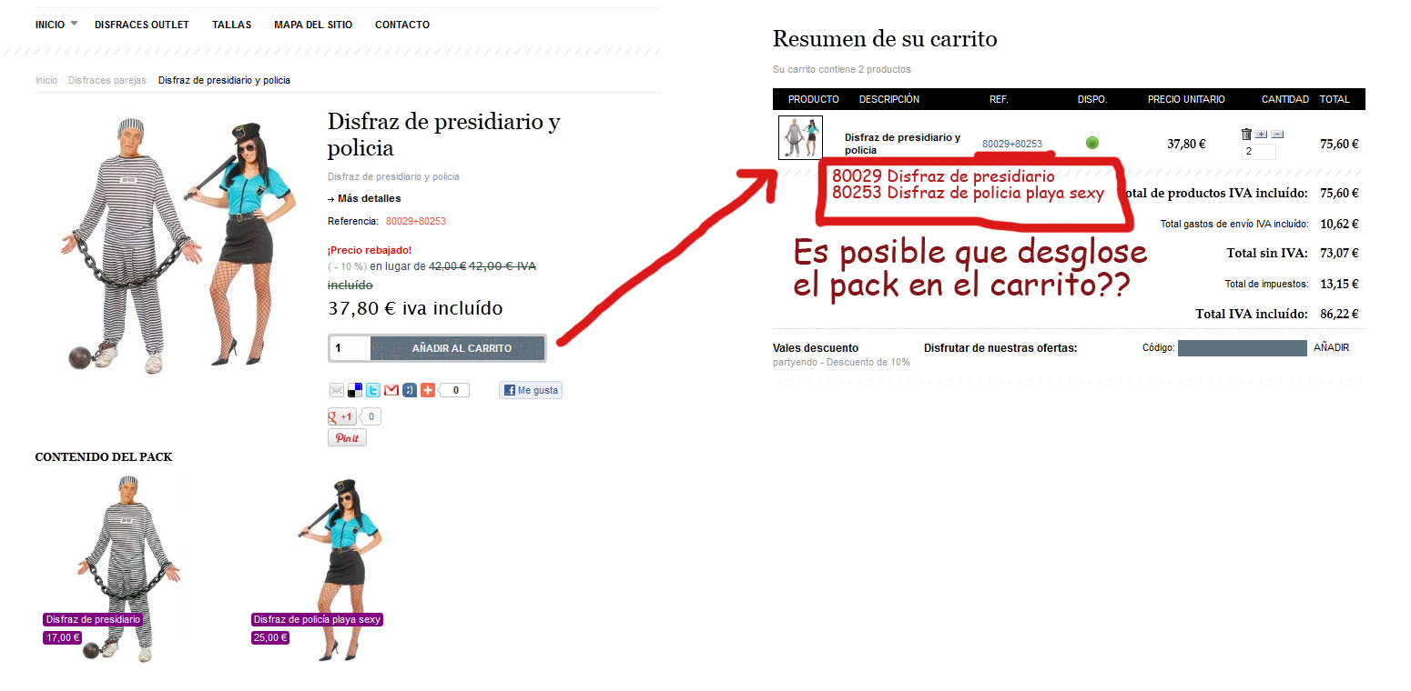 pixelatumente Posted April 14, 2012 Author Share Posted April 14, 2012 Creo un producto nuevo llamado "Disfraz de presidiario y policia" con referencia 80029+80253 (o la que sea) y activo la opción "paquete" y adjunto las referencias 80029 y la 80253. Grabo y se muestra correctamente, pero al añadirlo al carrito no desglosa los 2 disfraces del paquete, sale sólo el disfraz de presidiario y policia. No veo otra opción alternativa... Link to comment Share on other sites More sharing options...