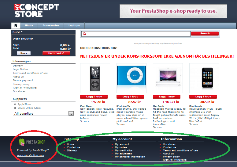 Surematu Posted April 15, 2012 Share Posted April 15, 2012 Hi. Can anyone help me removing the "Powered by PrestaShop™" mark (marked with a red circle at the picture), without removing the information on the righet side? (marked with a green mark at the picture) I have un selected the "display powered by prestashop" in CMS Block configuration ==> footer`s various links configuration. I have done this with the orginal template, and that was working, but not with this new template... I downloaded all files today, from prestashop`s website, so i think i have the newest version... I am really sorry for my bad english! Thanks for all help! Link to comment Share on other sites More sharing options...