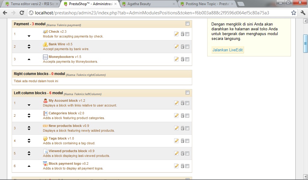 Para master, tolong bantu saya dong... Saat mengelihat tampilan toko berharap berubah lebih baik setelah mengubah posisi halaman awal toko lewat LiveEdit, saya malah mendapati tampilan toko saya jadi hilang di bagian tengah dan block kanannya. Minta tolong cara mengembalikannya dong..