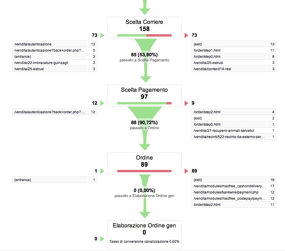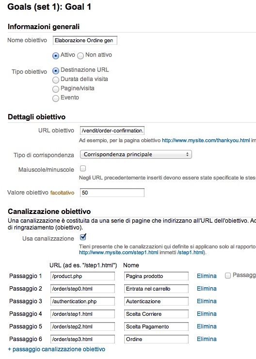 azzchemoto Posted April 21, 2012 Author Share Posted April 21, 2012 Grazie innanzitutto per la risposta. Il fatto è che (secondo me) analytics non registra mai alcun obbiettivo raggiunto. Se non ho capito male, per definire un obbiettivo completato deve essere richiamata la pagina con il path corretto definita nel campo URL OBBIETIVO. La pagina "order-confirmation.php" a me pare che non sia mai raggiunta quando un ordine è stato completato, qualsiai che sia il tipo di pagamento scelto tra paypal, contrassegno, bonifico bancario o postepay. Difatti se si guarda la canalizzazione tali pagamenti determinano un uscita dal tunnel, senza raggiungere la parte finale dell'imbuto. Cosa non riesci a configurare, l'esempio del modulo va bene fin quando non sono impostate le friendly url, se impostate controlla tramite broswer come riporta i nomi delle pagine che vuoi monitorare e crei l'obbiettivo in questo modo. Spero di essere stato chiaro e di aver capito il problema. Link to comment Share on other sites More sharing options...