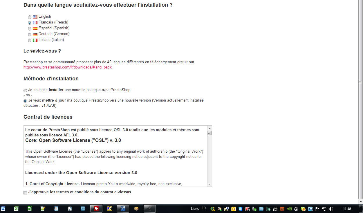 gatubi Posted April 25, 2012 Share Posted April 25, 2012 Bonjour à tous, j'essaie vainement de mettre ma boutique à jour de la version 1.3.2.3 à 1.4.7.3. J'ai suivi le tutoriel mis à disposition par prestashop, tout se passe bien, mais lors de la mise à jour via l'interface graphique navigateur ( /install ), juste après avoir accepté les termes et conditions du contrat, rien ne se passe. Pas de bouton suivant ni quoi que ce soit. J'ai vérifié mon ftp et tous les dossiers ont l'air d'être là. Que dois-je faire pour pallier à ce problème? Passer par une mise à jour intermédiaire? Merci de votre aide, bonne soirée à tous gat Link to comment Share on other sites More sharing options...