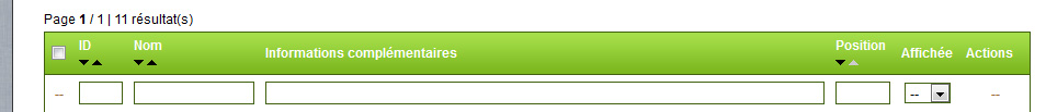 kiwoo Posted May 2, 2012 Share Posted May 2, 2012 Bonjour, Pour simplifier le visuel pour un client, je souhaiterais supprimer la ligne de tableau où il y a les filtres dans l'admin (cf pièce jointe). Je crois comprendre que cela se situe dans le fichier /classes/AdminTab.php mais je n'arrive pas à situer la ligne TD à supprimer. Je souhaiterais également supprimer les petites flêches situées en dessous de ID, Name et position. Que me conseillez-vous ? Link to comment Share on other sites More sharing options...