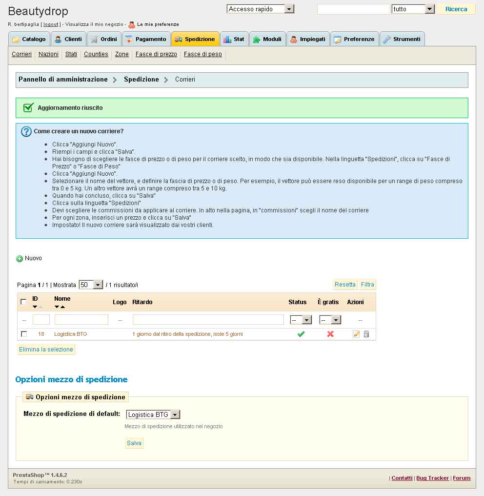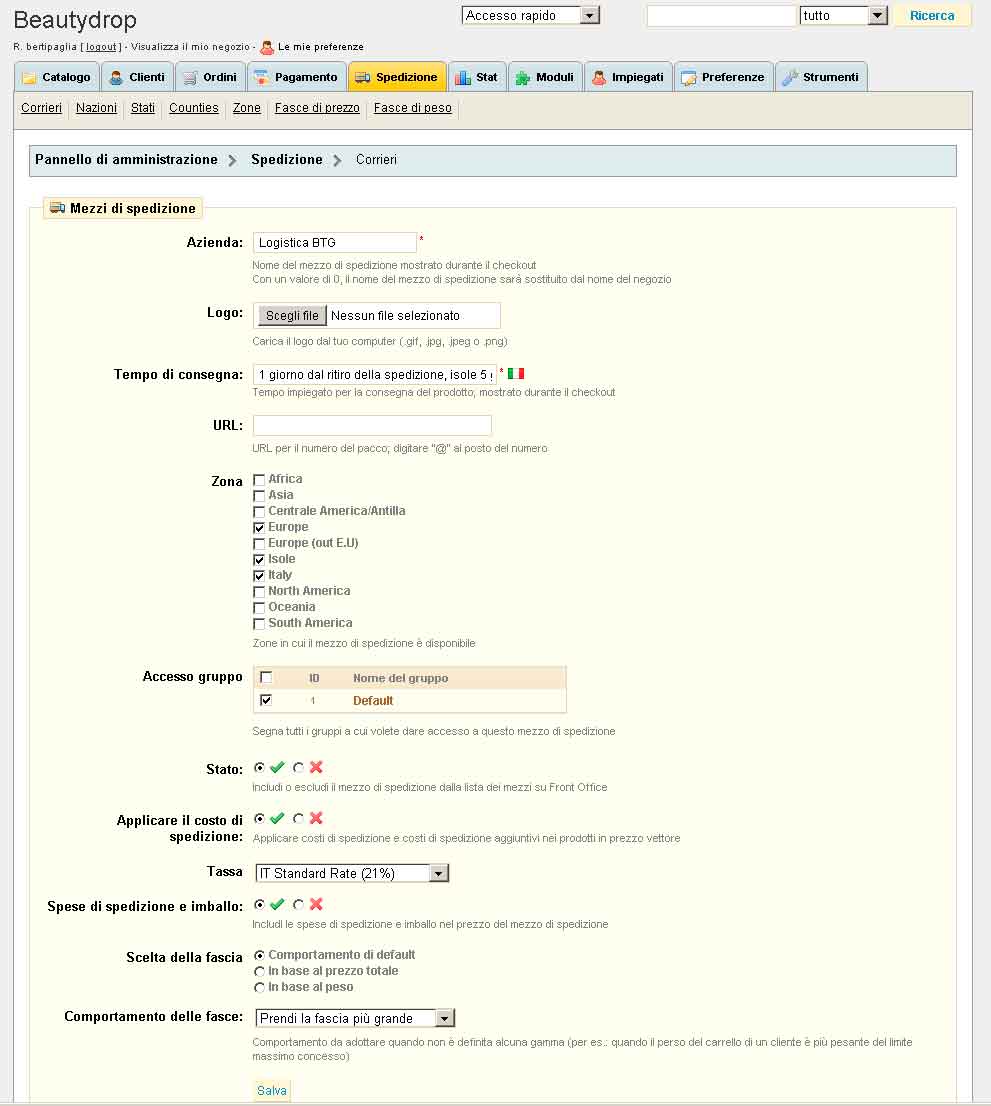 Codencode Posted September 24, 2012 Share Posted September 24, 2012 Per differenziare le spedizioni in base a zone differenti, bisogna creare tante "Zone" (Spedizioni => Zone) differenti, quindi associare le province (nel caso dell'Italia) alle varie zone e creare tanti range di prezzo/peso per le varie zone. Fatto questo vanno assegnate le zone create al corriere e solo ora è possibile specificare il costo per le varie fasce create. E' facile capire che per l'Italia è possibile specificare costi differenti per le varie province, ma non per singoli comuni, questo almeno utilizzando le funzionalità incluse nella piattaforma. Link to comment Share on other sites More sharing options...