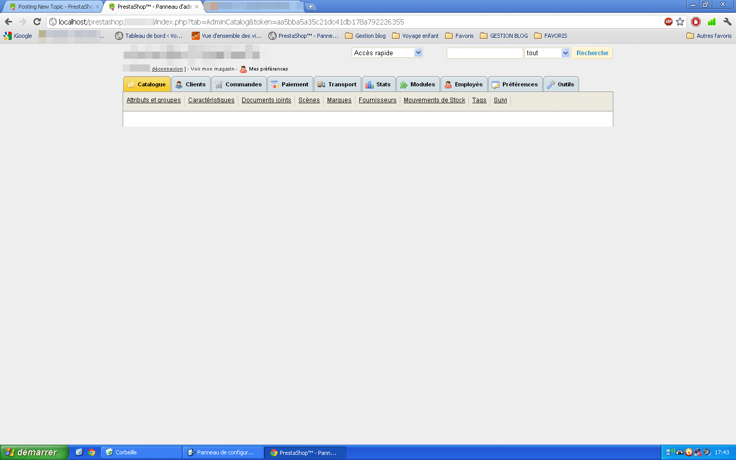 Sandrineve Posted May 4, 2012 Author Share Posted May 4, 2012 Bonjour, au secours j'ai désinstaller prestashop puis réinstaller et ca ne marche toujours pas. donc impossible de créer des catégories , de créer mes articles . SVP aidez moi!!!! Link to comment Share on other sites More sharing options...