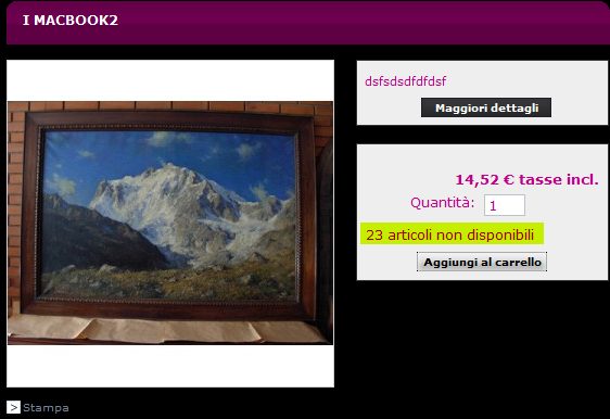 joint77 Posted May 3, 2012 Share Posted May 3, 2012 Ciao, sono da una settimana iscritto al forum e sto scoprendo questo affascinante open source. Avrei una domanda, perchè avendo 24 prodotti in magazzino mi esce nella scheda "23 articoli non disponibili" (vedi immagine)? C'è modo di toglierli via BO o via codice? Stessa cosa per "tasse incl." c'è modo di togliere la dicitura e tenere solo in prezzo da BO o via codice? Ringrazio antcipatamente, Ale. Link to comment Share on other sites More sharing options...