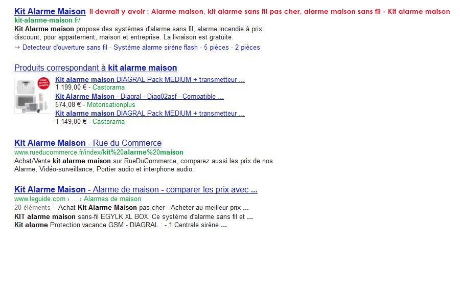 caso Posted May 4, 2012 Author Share Posted May 4, 2012 Et bien par exemple, lorsque vous tapez sur google : kit alarme maison Nous sommes en premiere page et vous pouvez lire par ordre de position. 1 Kit Alarme Maison kit-alarme-maison.fr/ 2 Kit Alarme Maison - Rue du Commerce www.rueducommerce.fr/index/kit%20alarme%20maison 3 Kit Alarme Maison - Alarme de maison - comparer les prix avec ... www.leguide.com › ... › Alarmes de maison 4 Alarme Maison Tryba protection : Système d'alarme sans fil www.tryba-protection.com/ Nous voyons apparaitre que le nom du site : kit alarme maison alors qu'il devrait y avoir : Alarme maison, kit alarme sans fil pas cher, alarme maison sans fil - Kit alarme maison ce qui corrspond à l'index de ma home page. Vous comprenez ? Link to comment Share on other sites More sharing options...