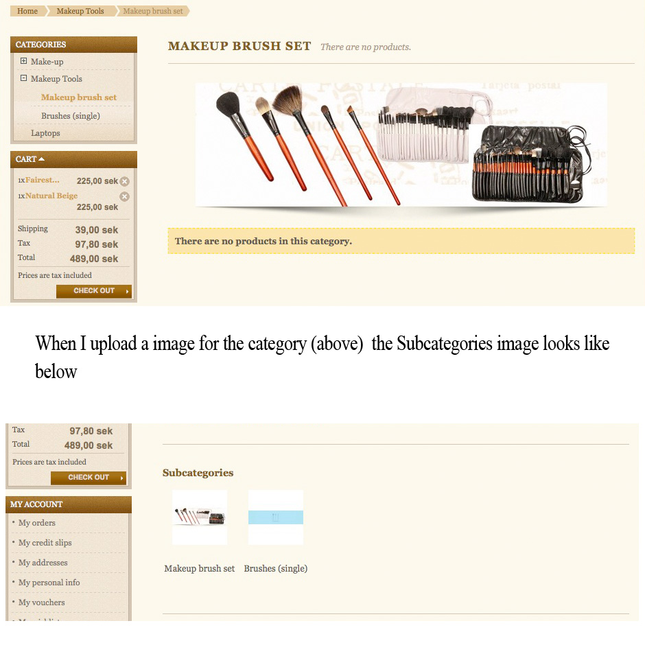 Studio1one Posted May 18, 2012 Author Share Posted May 18, 2012 haha chill made, I set things back to normal. I made a change for the subcategories and hope I understood you now haha Here is the link of changes I made: http://www.hairofbea...-makeup-verktyg hahahah NONO..... the size was right there but the image was not. If you make changes back again, you see its not filled out the space, its white above and below the red stripe. The proportions is/was wrong. Link to comment Share on other sites More sharing options...
