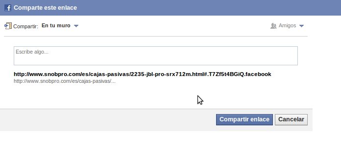 bulaphones Posted June 14, 2012 Share Posted June 14, 2012 Buenas, al compartir un producto en facebook por ejemplo, solo aparece el enlace del mismo, pero no la imagen ni el texto. He probado con varios módulos como addthis, el genérico de compartir en facebook, y unos cuantos más. Esos mismos módulos los he probado en un prestashop limpio y funcionan correctamente. En definitiva, los módulos se comportan bien, pero al compartir sólo aparece el enlace del producto. Adjunto imágen. Gracias de antemano. Hola a mi se me soluciono el problema... te explico.. tenia agregados productos similares y tenian el casi el mismo nombre: http://www.mipagina.com/holsters/58-holster-combo-para-iphone-4-4s-azul.html http://www.mipagina.com/holsters/58-holster-combo-para-iphone-4-4s-rojo.html asi lo que hice fue agregar cmabiar un poco el nombre de produto y meta title para que funcionara.. http://www.mipagina.com/holsters/58-holster-combo-para-iphone-4-4s-azul-funda-y-clip.html tambien debes checar que la fotos principal tenga el mismo nombre que el del producto.. espero te haya podido ayudar Link to comment Share on other sites More sharing options...