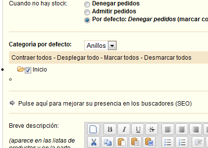 Lex-Luthor Posted May 20, 2012 Author Share Posted May 20, 2012 Desde que has instalado prestashop, te esta pasando? O te ha pasado de pronto y antes te iba bien? Has realizado alguna importación masiva o has ido metiendo los datos mano? Me está sucediendo desde el principio, o eso creo. Por lo menos no lo he detectado hasta que no me he visto en la necesidad de cambiar la categoría de un producto. No he realizado ninguna importación de datos ni ninguna actualización de versión de PS. Link to comment Share on other sites More sharing options...