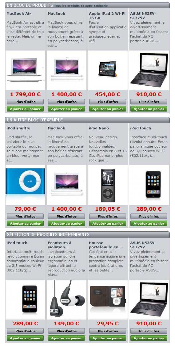 Graphart créations Posted May 20, 2012 Share Posted May 20, 2012 (edited) Ajoutez autant de blocs produits phares que vous le souhaitez et maîtrisez les produits que vous y affichez. Vos clients vont bénéficier, dès la page d’accueil, de vos sélections qui pourront être mise à jour quotidiennement, en quelques clics. Visitez la fiche produit pour avoir toutes les informations nécessaire, copie d'écran ... Compatibilités : Prestashop 1.4.x Liens : Demonstration ici Fiche produit ici Edited May 23, 2012 by Graphart créations (see edit history) 1 Link to comment Share on other sites More sharing options...
