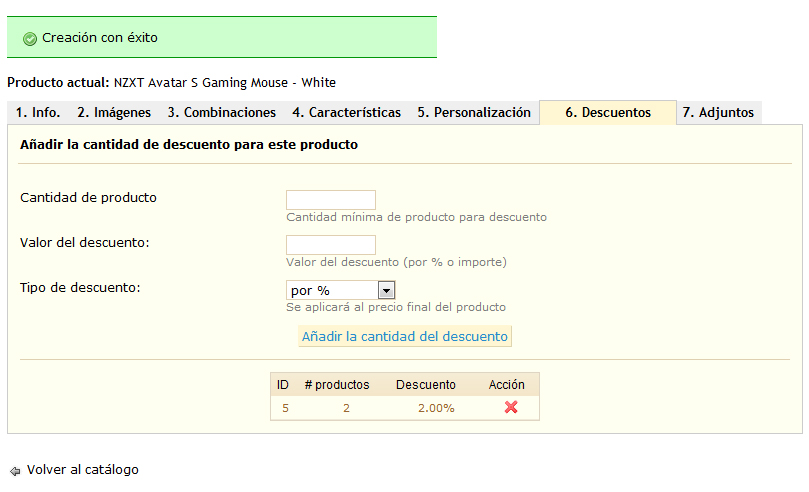 nadie Posted May 22, 2012 Share Posted May 22, 2012 Supongo que al tener una version mas antigua, no vere la pestaña de precios con ese nombre, me salen estas: 1 Info - 2 Imagenes - 3 Combinaciones - 4 Caracteristicas - 5 Personalizacion - 6 Descuentos - 7 Adjuntos. He estado echandole un ojo detenidamente a todas pero la verdad es que no se como hacerlo. Tambien he instalado el modulo "Specials block with caroussel v0.2" y tampoco se añadir productos para que se vean en este modulo. Acabo de buscar tutoriales por google, pero no encuentro nada, solo hay un video de añadir vales de descuento o algo asi. Gracias nadie. Pues en tu caso es la pestaña descuentos. Link to comment Share on other sites More sharing options...