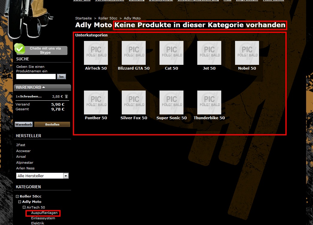 Scooter-Zone Posted May 22, 2012 Share Posted May 22, 2012 Hallo wo hier gerade ein Thema offen ist wegen dem Kategorie kram ich habe da direkt mal eine bzw mehrere fragen. Ich habe ein Bild angehängt zur Verdeutlichung. Ich würde gerne den Block mit den Unterkategorien was auf der Hauptseite ist entfernen. Leider weis ich nicht wo und was dafür gemacht werden muss. Ich würde halt gerne meine Menü Links so einstellen das ein Ergebnis erst dann auf der Hauptseite erscheint wenn man in der letzten gewählten Kategorie ist. Zur Erklärung: Der Kunde klickt auf Roller 50cc oder auf Adly Moto und auf der Hauptseite werden immer die Bilder der Unterkategorie angezeigt. Im Fall meines Shops sollte es so ablaufen... Kunden klickt -Roller 50cc -Adly Moto -AirTech50 - Auspuffanlagen <- und jetzt soll erst ein Ergebnis angezeigt werden! Wie, wo und was muss ich einstellen um das so hin zu bekommen? Gruß Link to comment Share on other sites More sharing options...