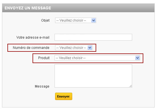 Prestatest Posted May 23, 2012 Share Posted May 23, 2012 (edited) Bonjour, Je souhaite retirer les champs de sélection "Numéro de commande" et "produit" dans les Email, car cela déstabilise les clients qui souhaitent juste des informations. Ils nous appellent pour prévenir qu'ils n'ont pas passer de commande donc pas de numéro de commande, ce qui montre que cette option ne doit plus être sur notre site. Voici la photo d'illustration des champs à retirer. J'ai bien entendu regarder du coté de "contact-form.tpl" dans mon dossier thème. Mais étant novice, j'ai surement été trop "bourrin" car j'ai tout bonnement supprimé les codes se rapportant au "id_order" et "id_product". Cela à bien entendu résulté d'une page blanche dans la section contact en front office. J'ai aussi été surpris car j'ai pris le fichier contact-form.tpl, avec et sans l'intégration du "joindre un fichier" et étonnamment quand j'ai comparé les 2, le code était le même..pourtant d'un coté il affiché le "joindre un fichier" et de l'autre non...(j'ai fait cela, pensant que ça m'aiderait à comprendre le code qu'il faut retirer ou modifier quand on change un champs sur la page contact..) Donc étant vite arrivé à ma limite de connaissance, je me permet de demander un peu d'aide pour résoudre ce petit soucis. Merci, Edited June 19, 2012 by Prestatest (see edit history) Link to comment Share on other sites More sharing options...