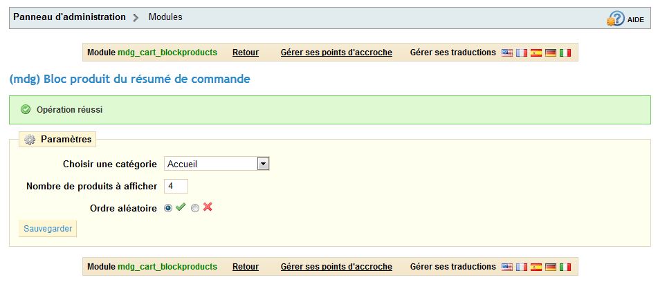 Graphart créations Posted May 24, 2012 Share Posted May 24, 2012 Afficher des produits sous forme de suggestions sur la page du résumé de commande. Ce module vous permet de choisir d’afficher les « nouveautés », les « meilleures ventes », et les produits en « promotion » de votre e-boutique. Mais il permet aussi de choisir toute autre catégorie en comptant bien entendu la page « Accueil » utilisée habituellement pour afficher les produits phares. Informations: Tarif : 32.00€ Prestashop 1.4.x Demonstration ici Fiche produit ici Pour tester le module ; identifiez vous avec l’email « [email protected] » et le mot de passe « demos ». Remplissez le panier et allez sur la page du résumé de commande. Exemple Front-office : Page du back-office : Link to comment Share on other sites More sharing options...
