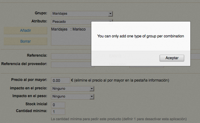 Quiero simular algo como eso, asi que se me ocurrió crear grupos de atributos, pero justo me acabo de dar el tortazo al asignar atributos a una botella de vino, ya que no quiero crear combinaciones porque no hay diferentes opciones para un mismo vino. Simplemente quiero asignar atributos a un vino, para posteriormente utilizarlo como factores de filtrado, nada mas. Concretamente me he tropiezado con el problema del grupo "UVAS", porque un mismo vino puede haber sido elaborado con varios tipos de uvas, sin embargo al asignar atributos en "Combinaciones" no me deja asignar mas de un atributo del mismo grupo. Y como decía antes, no quiero crear combinaciones; cada vino es unico y precio unico.