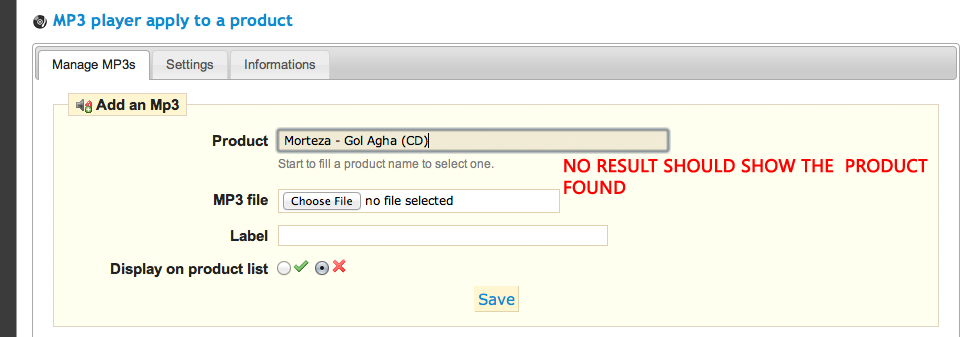 tawanghar Posted May 25, 2012 Share Posted May 25, 2012 Hi guy, I really hope somebody can help me with this, I just bought this module, and everything is fine, except http://addons.prestashop.com/en/front-office-features/100-mp3-player.html After adding like 20 product, when you try to add a new product, when the name is types, no result is found, the product is in my catalog 100%, and I even copy and pasted the name and nothing happens, Please help, Appreciate anybody with any solutions Sincerely ART Link to comment Share on other sites More sharing options...