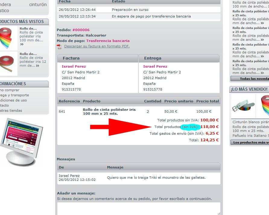joshua007 Posted May 26, 2012 Author Share Posted May 26, 2012 Gracias. Y el segundo apartado. En el panel del cliente en mis pedidos aparece un error de sin iva dentro del resumen del pedido ver img . Como puedo corregir este error? Link to comment Share on other sites More sharing options...