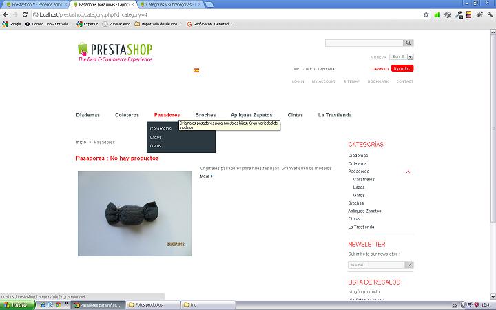 nadie Posted May 27, 2012 Share Posted May 27, 2012 Hola a todos, Estoy configurando mi tienda en modo local y una vez la tenga terminada subirla al servidor. He creado diferentes categorias (diademas, pasadores, coleteros) y dentro de cada una de ellas otras subcategorias (lazo, caramelo, gato...). La cuestion es que me gustaria que cuando alguien pinche por ejemplo en pasadores le cargue una pagina donde aparezcan las diferentes subcategorias (lazo, caramelo, gato) y a continuación poder elegir la deseada para que en otra pagina ya muestre solo los productos concretos. Actualmente cuando pincho en pasadores me dice que no existe ningun producto, en cambio si en el menu pincho directamente en pasadores-gato, ya si que me aparecen los productos dentro de esa categoria... ¿Donde puedo configurar este aspecto? A ver.. que me termine de enterar. Tienes una categoría General, dentro de esa categoría tienes 3 subcategorías. Y dentro de esas 3 subcategorías tienes los productos insertados. Y comentas cuando pinchas en la categoría general, no te salen en el centro las subcategorías correspondientes a esa categoría. Normalmente, cuando pinchas en una categoría, aparecen las subcategorías, y los productos que hayas asignado a esa categoría, que no quiere decir que sean los productos que tengan las subcategorías.. Tienes tu tienda online, para verlo? Link to comment Share on other sites More sharing options...