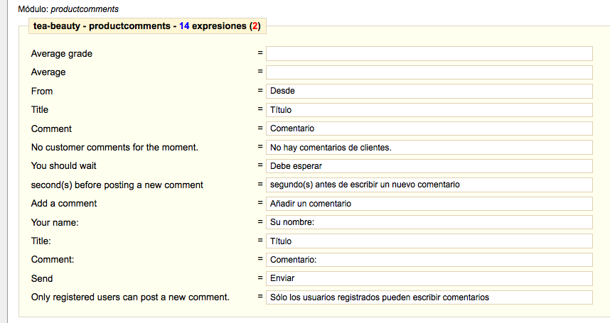 nadie Posted May 28, 2012 Share Posted May 28, 2012 Gracias por la info, aunque no te acabo de entender bien... He visto esto: <li><a href="#idTab5" class="idTabHrefShort">{l s='Comments' mod='productcomments'} ({$nbComments})</a></li> He comprobado que efectivamente ése es el módulo en cuestión. Pero si lo cambio a mano, perderé la posibilidad de tenerlo en inglés. Como ves, los campos "comment" y "comment:" están traducidos. Date cuenta que el campo es "Comments" y no "Comment" y en esa imagen no dice nada de "Comments" Link to comment Share on other sites More sharing options...