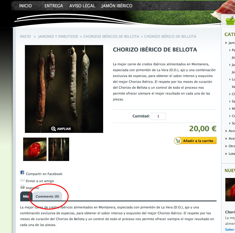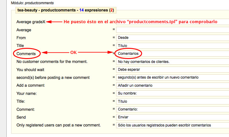 tamaron Posted May 28, 2012 Author Share Posted May 28, 2012 (edited) Gracias por la info, aunque no te acabo de entender bien... He visto esto: <li><a href="#idTab5" class="idTabHrefShort">{l s='Comments' mod='productcomments'} ({$nbComments})</a></li> He comprobado que efectivamente ése es el módulo en cuestión. Pero si lo cambio a mano, perderé la posibilidad de tenerlo en inglés. Como ves, los campos "comment" y "comment:" están traducidos. Edited May 28, 2012 by tamaron (see edit history) Link to comment Share on other sites More sharing options...