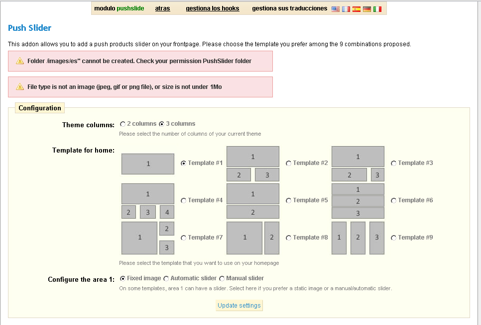 Liosmar Posted May 30, 2012 Share Posted May 30, 2012 (edited) Hola a todos, mi problema es el siguiente he comprado una platinlla la Cherry http://addons.presta...181-cherry.html la cual trae incluido el modulo Push Slider y al tratar de subir una imagen para publicar los banners me da los siguientes errores Folder /images/es" cannot be created. Check your permission PushSlider folder File type is not an image (jpeg, gif or png file), or size is not under 1Mo Por supuesto ya he cambiado los permisos en el hosting he probado distintos formatos de imagenes, de distintos tamaños siempre intentado cumplir con los parámetros indicados y sigo teniendo los mismos errores adjunto un screenshot para que sepan a que me refiero saludos espero me podáis ayudar Edited May 30, 2012 by Liosmar Totalmente prohibido adjuntar módulos de pago en el foro (see edit history) Link to comment Share on other sites More sharing options...