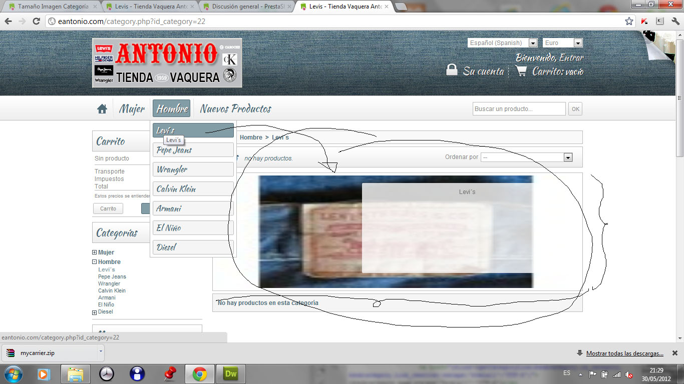 nadie Posted May 30, 2012 Share Posted May 30, 2012 Observando tu tienda, veo que tienes en el css, en el fichero: themes/jeanslook/css/category.css la siguiente linea: #categoryImage { width: 728px; height: 225px; padding: 5px; } Lo cual hace que tu imagen se este deformando, tal como muestras en la captura que envías. Link to comment Share on other sites More sharing options...