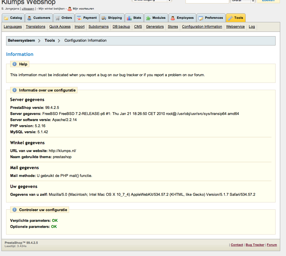 Ik zag al aan je configuratiepagina dat je bij TransIP zit. Ik vermoed dat je op Prestashop versie 1.4.2.5 zit. Dat is een redelijk oude Prestashop versie en ik snap niet waarom TransIP niet een recentere versie aanbiedt voor nieuwe shops.