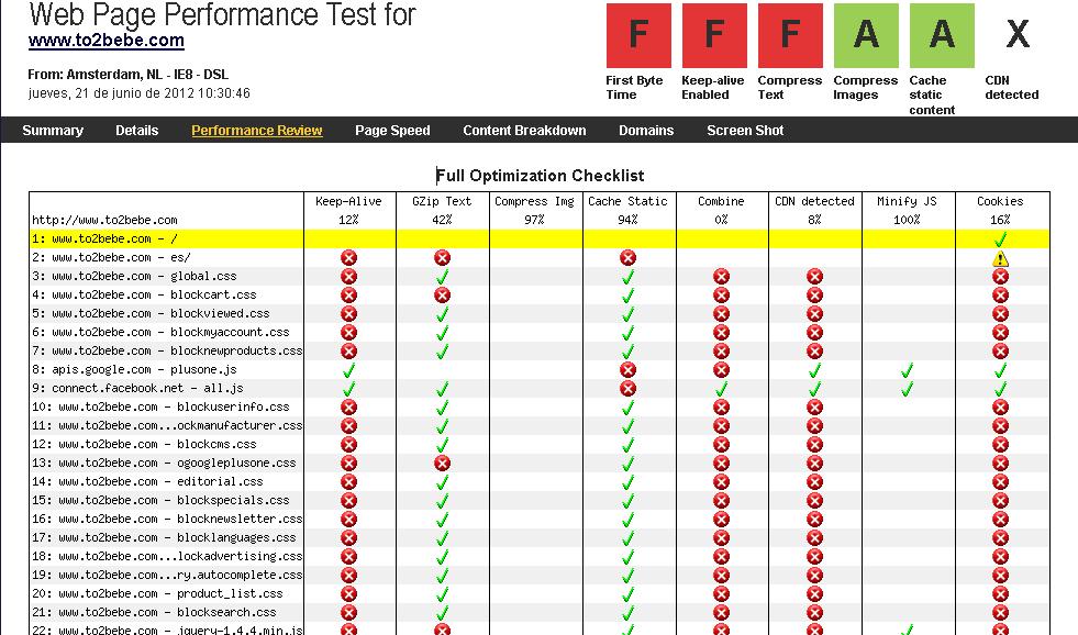 to2bebe & Kids Posted June 21, 2012 Share Posted June 21, 2012 (edited) Hello everybody, I run a webpagetest and was suprised to see the poor results of this ...(see file below) Anyone has an idea where to start making modifications because i am lost in this subject... Regards david www.to2bebe.com Edited June 21, 2012 by daviddive007 (see edit history) Link to comment Share on other sites More sharing options...