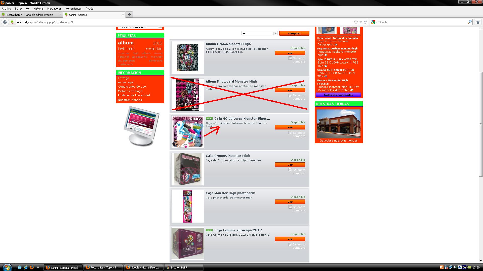 seron Posted June 25, 2012 Author Share Posted June 25, 2012 Si te refieres a las cajas de los listados de los productos: Usted deberá ir al fichero: /themes/prestashop/css/product_list.css Buscar esto: ul#product_list li { background: #D0D3D8 url('../img/block_category_item_bg.jpg') repeat-x; border: solid 1px #D0D3D8; padding: 6px; min-height: 130px; height: auto; clear: both; margin-bottom: 0.3em; } Y donde dice background: asignarle el nuevo background. Muchas Gracias nadie, tengo un problema y es que tengo predeterminado el color del texto de la web en blanco en el globall.css entonces hay cosas que no se me ven como por ejemplo donde sale el carrito, la palabra "vacio" no sale porque esta en blanco como la cambio de color?Y tambien en comentarios, donde cambio el color donde sale los comentarios de cada producto. Link to comment Share on other sites More sharing options...