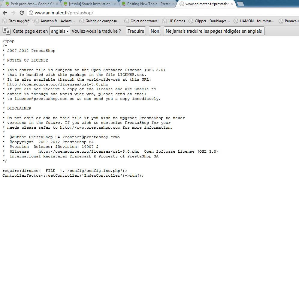 animatec Posted June 29, 2012 Share Posted June 29, 2012 Bonjour , J'ai installé Prestashop en local pas de problème , mais lorsque que je mets le répertoire sur le serveur web , j'ai les codes php qui sont visible sur chrome et sur IE il me demande de télécharger le fichier index.php. J'ai modifié le fichier setting , la base de donnée est installé , et normalement c'est de PHP 5 J'ai également modifié le fichier htaccess Je ne sais pas , j'ai besoin d'aide. Ci joint la capture d'écran Merci Frédéric Link to comment Share on other sites More sharing options...