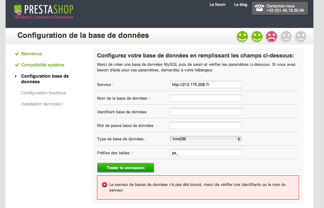 Mon problème : je suis bloqué à l'étape 3 de l'installation (Configuration de base de données), j'ai tant bien que mal réussi à créer une bdd sans mot de passe mais j'ai de gros doutes sur le nom du serveur : http://213.175.208.7/ , qui est comme vous le voyez une adresse ip.