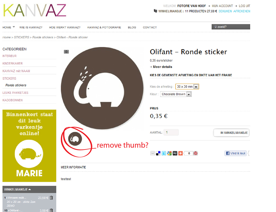 Svanhoof Posted June 29, 2012 Share Posted June 29, 2012 (edited) Hello all, I'm creating in my webshop a category with stickers. You can choose the size and the color. There are 24 colors and 3 sizes. When you choose a color, the product image also change in the same color. BUT there is always a thumbnail under the main image that shows exactly the same image (but than in a smaller version). (see attachement). Is there a way to remove the thumbnail because it's a little bit confusing for the customers and it's not necessary to show the picture twice. Thanx for your help! Here is the link: http://www.kanvaz.be...?id_product=425 Edited June 29, 2012 by Svanhoof (see edit history) Link to comment Share on other sites More sharing options...