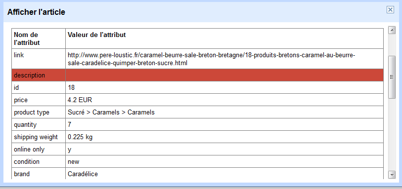 pascal82 Posted August 8, 2012 Share Posted August 8, 2012 La description détaillée est sous la forme "decription_long" ? Je veux dire pour que le module prenne en compte la descritpion détaillée et pas la description courte (que je laissé en blanc...) Merci ! Bonjour, avez-vous résolu vos soucis ? J'ai moi-même dû modifier ce module pour qu'il marche correctement. Une solution à votre problème initial était effectivement que vous n'aviez pas saisi de valeur dans "Résumé". N'auriez-vous pas pu saisir le début de votre description détaillée dans le résumé ? => c'est ce que j'ai fait pour le site www.mobilema.fr , regardez la fiche relative au chargeur solaire ici ... j'ai recopié les premières lignes de la description sous la video ! Ensuite j'ai dû corrigé pas mal le code pour que les attributs attendus par Google Merchent Center soient corrects: j'explique dans le post suivant ce que j'ai fait. En souhaitant que cela puisse vous aider Link to comment Share on other sites More sharing options...