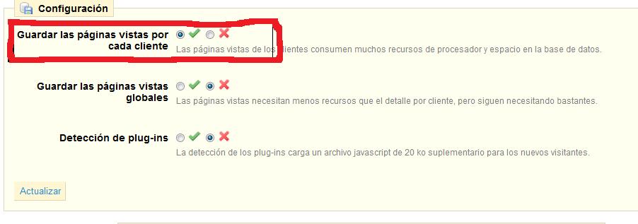 capitaldelpoker Posted July 5, 2012 Share Posted July 5, 2012 Hola Aquí de nuevo, Tengo mucho que aprender... Estoy buscando este modulo esta la opción "páginas vistas por cada cliente" Debe activar la opción "páginas vistas por cada cliente" en el módulo "Recuperación de datos estadíisticos" para visualizar las páginas consultadas por sus clientes. Gracias Buenas noches Malva Pincha sobre la pestaña Modulos>Analisis y Estadisticas>Explotacion de datos para las estadisticas>configurar te saldra una pantalla como la adjunta Lo marcado sobre rojo es lo que tienes que activar. Espero haberte ayudado 1 Link to comment Share on other sites More sharing options...