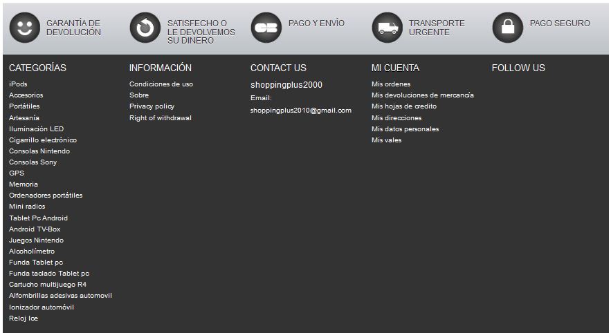 ellisto Posted July 14, 2012 Author Share Posted July 14, 2012 Hola de nuevo papitaldelpoker, he tenido que hacer eso, ir modificando los prámetros hasta que he dado en el blanco. El problema no estaba en la cantidad de categorías. Pero claro al tener tantas categorías, parece como que no está muy estético, pero no se me ocurre otra idea Por favor, acepto comentarios al respecto, para poder dejar un pie de página decente. Pongo a continuación las modificaciones del FOOTER del global.css de la plantilla " prestashop_new" para que le pueda servir a otro usuario que tenga el mismo problema: ************************************************************************************************ FOOTER ************************************************************************************************ */ #footer { color:#fff; background:#333 } .blockcategories_footer, #footer .myaccount , #block_various_links_footer, #social_block, #block_contact_infos { float:left; width:175px } } .blockcategories_footer {margin-left:0} #footer h4 { padding-bottom: 10px; text-transform:uppercase } #footer h4, #footer h4 a { font-weight:normal; font-size:14px; color:#fff } #footer a {color:#fff} #footer a:hover {text-decoration:underline} #footer ul {list-style-type:none} #footer li {padding:2px 0} #footer li a {color:#fff} .category_footer { width:171px !important; } /* ************************************************************************************************ Saludos y gracias por vuestra colaboración Link to comment Share on other sites More sharing options...