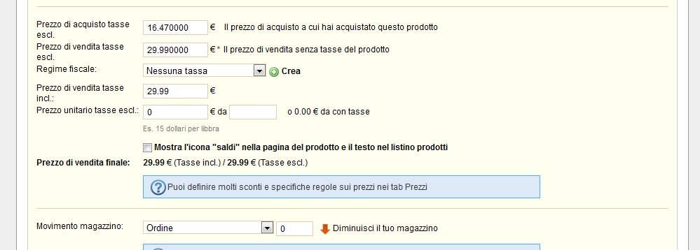 antares62 Posted July 12, 2012 Share Posted July 12, 2012 Ciao Peppe io a quanto pare ho il problema inverso a me servono tanti numeri ma che siano giusti (vedi mio post) Ad ogni modo, non sono riuscito ancora a capire come manipolare le cifre e spero che qualcuno più abile di me mi fornisca dei suggerimenti, però una cosa piuttosto empirica la puoi fare, che è forse anche meglio di andare a smanettare sui conteggi. Puoi registrengere le Input Box in modo da non vedere gli zeri Apri il file AdminProducts.php e alle righe 2497 e 2489 cambi il valore di <Input size> che adesso dovrebbe essere 11. Metti a 2 o 3 (<input size="2") e non li vedi più bye Paolo Link to comment Share on other sites More sharing options...